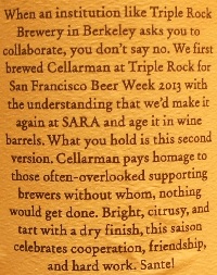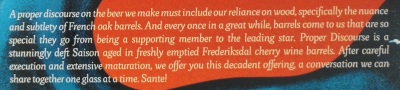 Brewer Description: (from bottle) A proper disclosure on the beer we make must include our reliance on wood, specifically the nuance and subtlety of French oak barrels. And every once in a great while, barrels come to us that are so special they go from being a supporting member to the leading star. Proper Disclosure is a stunningly deft Saison aged in freshly emptied Frederiksdal cherry wine barrels. After careful execution and extensive maturation, we offer you this decadent offering, a conversation we can share together one glass at a time. Sante!