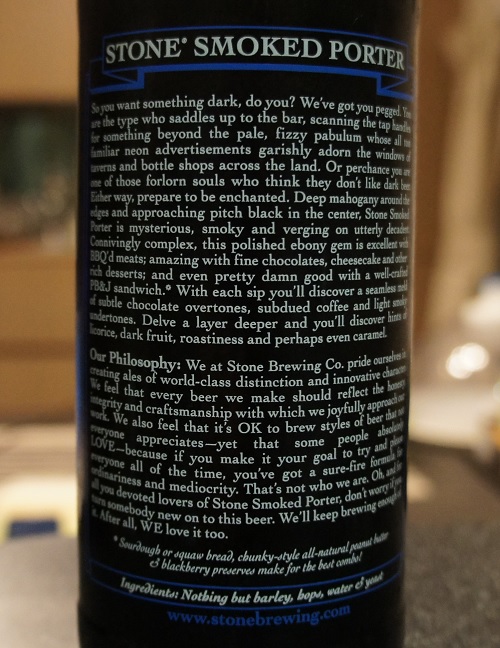 Brewer Description: (from bottle) So you want something dark do you? We’ve got you pegged. You are the type who saddles up to the bar, scanning the tap handles for something beyond the pale, fizzy pabulum whose all too familiar neon advertisements garishly adorn the windows of taverns and bottle shops across the land. Or perchance you are one of those forlorn souls who think they don’t like dark beer. Either way, prepare to be enchanted. Deep mahogany around the edges and approaching pitch black in the center, Stone Smoked Porter is mysterious, smoky and verging on utterly decadent. Connivingly complex, this polished ebony gem is excellent with BBQ’d meats; amazing with fine chocolates, cheesecake and other rich desserts; and even pretty damn good with a well-crafted PB&J sandwich. With each sip you’ll discover a seamless meld of subtle chocolate overtones, subdued coffee and light smoky licorice, dark fruit, roastiness and perhaps even caramel.