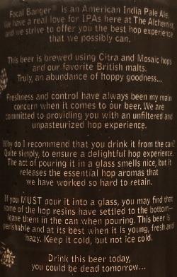 Brewer Description: (from can) Focal Banger is an American India Pale Ale. We have a real love for IPAs here at The Alchemist, and we strive to offer you the best hop experience that we possibly can. This beer is brewed using Citra and Mosaic hops and our favorite British malts. Truly, an abundance of hoppy goodness… Freshness and control have always been my main concern when it comes to our beer. We are committed to providing you with an unfiltered and unpasteurized hop experience. Why do I recommend that you drink it from the can? Quite simply, to ensure a delightful hop experience. The act of pouring it in a glass smells nice, but it releases the essential hop aromas that we have worked so hard to retain. If you MUST pour it into a glass, you may find that some of the hop resins have settled to the bottom – leave them in the can when pouring. This beer is perishable and at its best when it is young, fresh and hazy. Keep it cold, but not ice cold. Drink this beer today, you could be dead tomorrow….