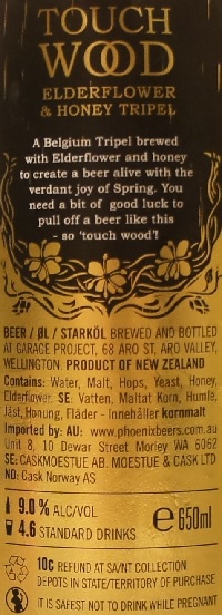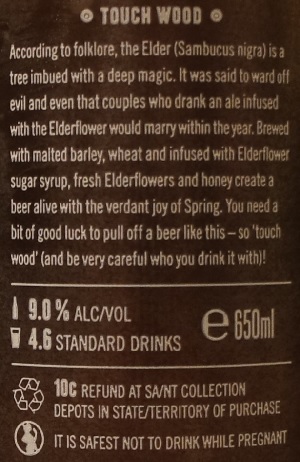 Brewer Description: (from inner paper wrap) According to folklore, the Elder (Sambucus nigra) is a tree imbued with a deep magic. It was said to ward off evil and even that couples who drank an ale infused with the Elderflower would marry within the year. In Denmark a female wood spirit called Hylde-Moer was said to inhabit the tree – woe betide anyone who took from the elder without its permission. The origins of the term ‘touch wood’ come from this desire to placate these woodland spirits. Here, malted barley and wheat infused with Elderflower sugar syrup, fresh Elferflowers and honey create a beer alive with the verdant joy of Spring. You need a bit of good luck to pull off a beer like this – so ‘touch wood’ (and be very careful who you drink it with)!